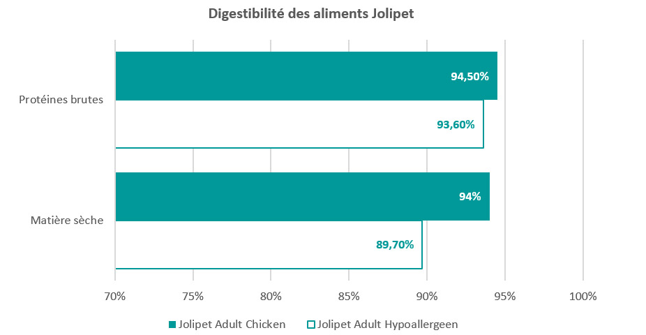 Enfin, nos propres recherches menées à l'Université de Gand montrent que nos régimes Jolipet présentent une digestibilité exceptionnellement élevée des nutriments. Nos recherches ont montré que le coefficient de digestion des régimes de Jolipet se situait entre 90 et 94%. Cela signifie que si votre chien mange 100g, il n'aura que 6 à 10g de selles. Le coefficient de digestion des protéines était encore plus élevé et s'élevait à 94%. En d'autres termes, ce que nous donnons à notre animal est absorbé au maximum. Ces chiffres sont beaucoup plus faibles pour les croquettes.
