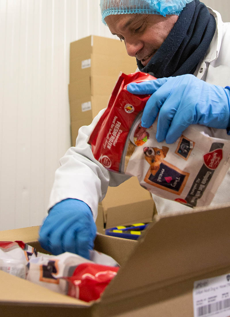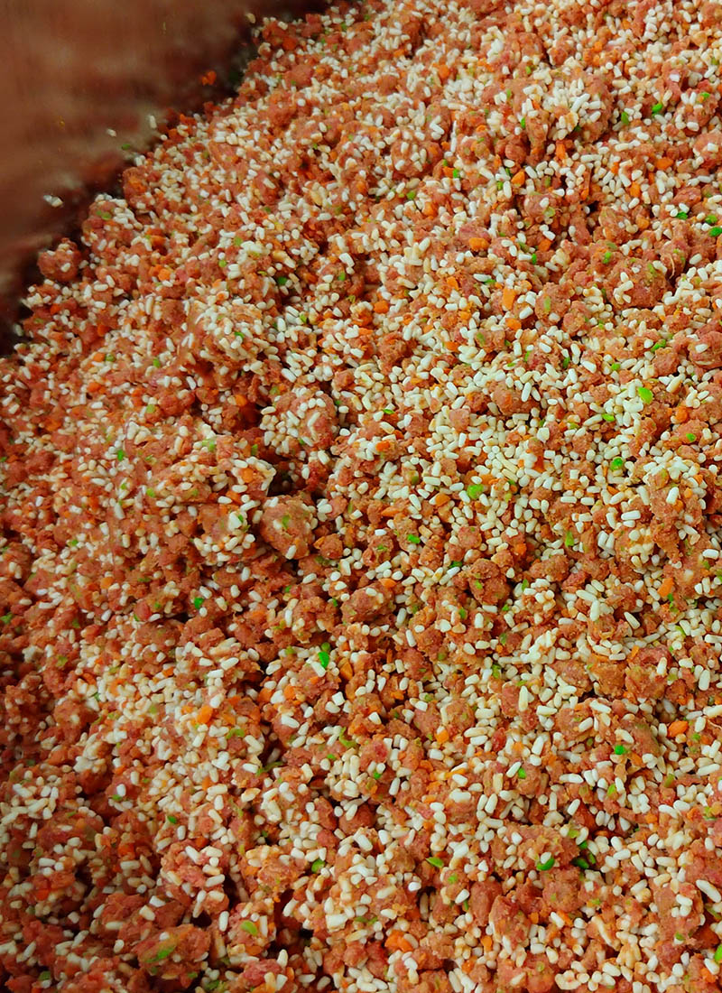 Het merendeel van het vlees dat we gebruiken is van humane kwaliteit tot op het moment dat het naar onze fabriek moet vertrekken. Dan krijgt het de bestemming ‘dierenvoeding’. Onze slagers gebruiken geen laagwaardig slachtafval (v.b. poten, pluimen) of goedkope vullers (vb. maïs, tarwe).